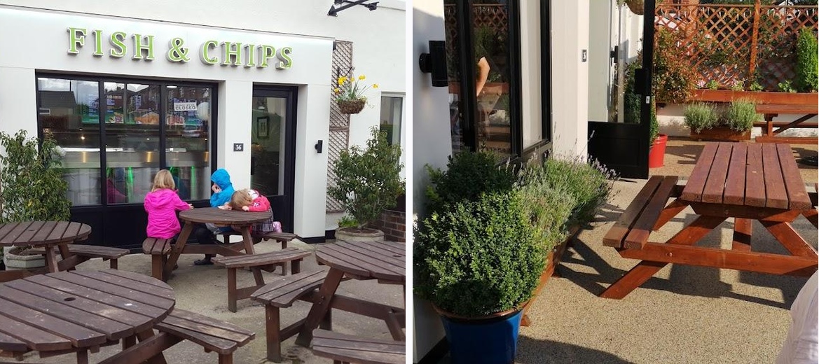 Lovely fresh food cooked while u wait, outside seating, beautiful on a sunny day surrounded by potted plants, well looked after and very clean, staff very helpful, I had a fantastic fish supper.